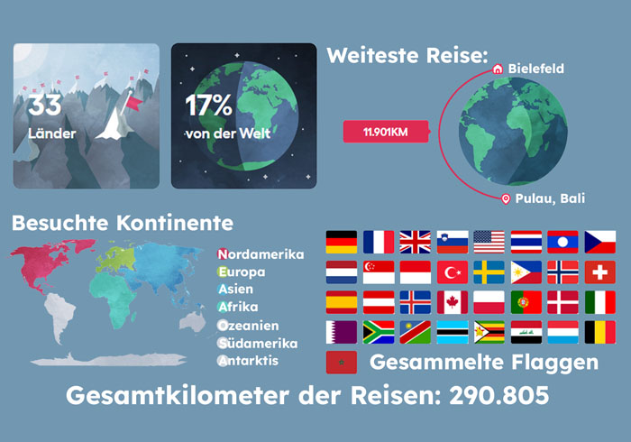 Genau aus diesem Grund habe ich mein Logo so gewählt: Ein glücklicher Rollstuhlfahrer on top of the world. Es steht für Neugier, Freiheit und die Überzeugung, dass grenzenloses Reisen auch mit eingeschränkter Mobilität möglich ist. Bis heute habe ich bereits 33 Länder bereist und dabei knapp 300.000 Kilometer zurückgelegt (Stand: Januar 2026) – und das ist erst der Anfang. Künftig möchte ich hier meinen Reiseblog veröffentlichen und zeigen, was trotz Rollstuhl alles möglich ist. Zur Dokumentation meiner Reisen nutze ich seit Kurzem Polarsteps. Die folgenden Links lassen sich auch ohne die App öffnen und geben euch die Möglichkeit, mich auf meinen Reisen ein Stück zu begleiten.